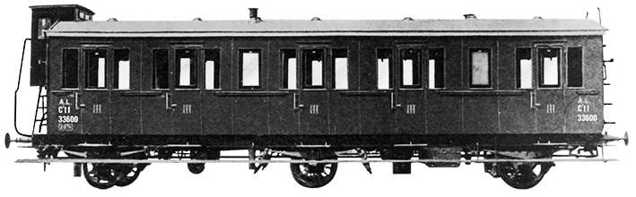 Voiture métallique à bogies, à couloir latéral, 18 places en 1e classe, 32 en 2e classe, compartiment à bagages, intercirculation, frein à distributeur.